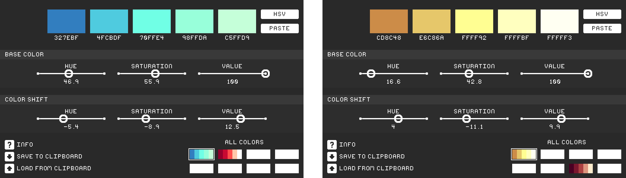 The color shift is how much the HSV changes between colors. To create nice-looking shades of a color, experiment with all three sliders.